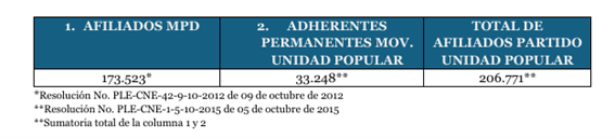 - Como resultado de la fusión y conforme se desprende de la información contenida en las resoluciones No. PLE-CNE-42-9-10-2012 de 09 de octubre de 2012 (aprobación del MPD) y No. PLE-CNE-1-5-10-2015 de 05 de octubre de 2015, (aprobación del Movimiento Unidad Popular) el PARTIDO UNIDAD POPULAR, Lista 2, cuenta con 206.771 afiliados.