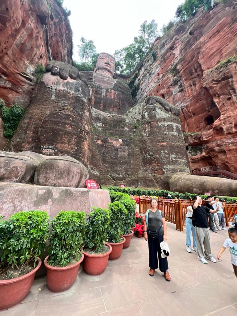 Luego de rodearlo bajamos por una escalera estrecha que discurría por el borde del acantilado, desde allí se observa un río de carácter feroz, sus remolinos y rizos trazaban patrones impredecibles. Las paredes, frías y húmedas, marcadas por los dedos de millones de peregrinos, me hablaban de historias compartidas. Abajo, una plaza llena de orquídeas y plantas ofrecía refugio. A la izquierda, los ríos Ming Jiang, Qingyi y Dadu se encuentran en su confluencia, a la derecha, el imponente Buda, de setenta metros de altura, se alza en toda su belleza, serenidad y fe, creando una atmósfera palpable.