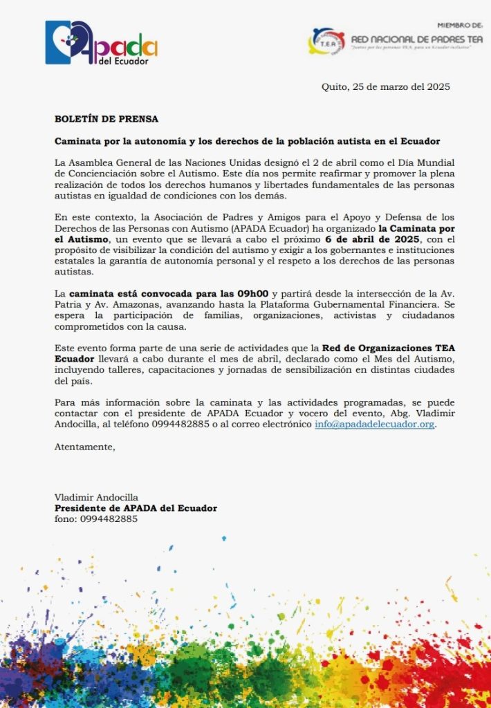 CULTURA Caminata por la autonomía y los derechos de la población autista del Ecuador Última actualización: 25/03/2025 7:36 pm Periódico Opción Published: 25/03/2025 compartir 0 Minutos de lectura compartir ETIQUETAS:Caminata autista Ecuador Comparte este artículo Facebook Whatsapp Whatsapp Email Copiar link Imprimir compartir Buscar Titulares, Noticias… Buscar por: Lo nuevo La bandera falsa, justificación de una agresión El alza del precio del petróleo no asegura alivio fiscal, pero sí encarece el costo de vida en Ecuador La guerra ajena y el saqueo propio Palantir y la guerra moderna IV parte Noboísmo: posdemocracia y acumulación Machu Picchu: energía tallada en piedra La guerra como negocio Museo Antropológico de la Universidad Central del Ecuador: testimonio de las culturas aborígenes Clima 10°C Quito nubes 10° _ 10° 83% Mié 18 °C Jue 19 °C Vie 19 °C Sáb 19 °C Dom 13 °C EtiquetasAMLO Apagones Armas arte Arte popular China Ciencia cine Claudia Sheinbaum Colombia Comunicación Corrupción CPCCS CPCCS-T Crisis Crisis económica CUCOMITAE Cultura Daniel Ortega DDHH DDHH Ecuador Defensa de Derechos Defensa del Agua Defensa de la vida Defensores de la naturaleza Defensores del Medio Ambiente Derechos Humanos Deuda externa Economía Ecuador Educación Educación superior EEUU Elecciones Equipo periodístico del diario El Comercio España Estados Unidos feminismo FESE FEUE FEUNASSC FMI Frente Popular FUT Galápagos Guayaquil guerra IESS imperialismo Inseguridad izquierda Jaime Hurtado González jubilados Levantamiento Popular Ecuador LOEI LOES Lucha social Maestros Jubilados Manabí Medio Ambiente Militarización mujeres Mundo Municipio de Quito México Narcotráfico neoliberalismo Noboa nulo Opinión Palestina Paquetazo economico Petróleo pobreza poesía Política privatizaciones privatización Quito Rafael Correa represión resistencia Rusia Salud Seguridad Social Solidaridad subsidios Terrorismo Trabajadores Trump Ucrania UNAPE UNE Unidad Popular Unidad Popular Ecuador Unidad Pöpular vacunas Venezuela Violencia estatal Voto nulo