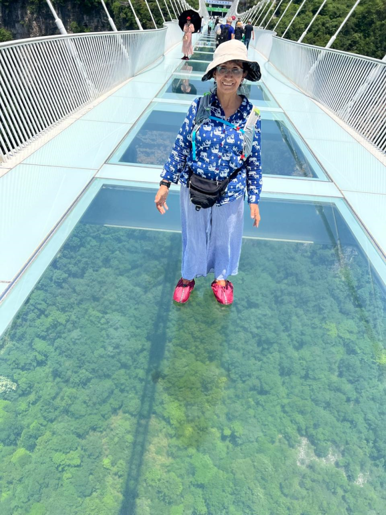 Al día siguiente tomamos un bus, tras una hora y una caminata adicional de media hora, llegamos a una especie de canchón, donde el personal nos entregó fundas cubrezapatos, fuera nos esperaba el Zhangjiajie Grand Canyon Glass Bridge (puente de vidrio) de 430 metros de largo.
