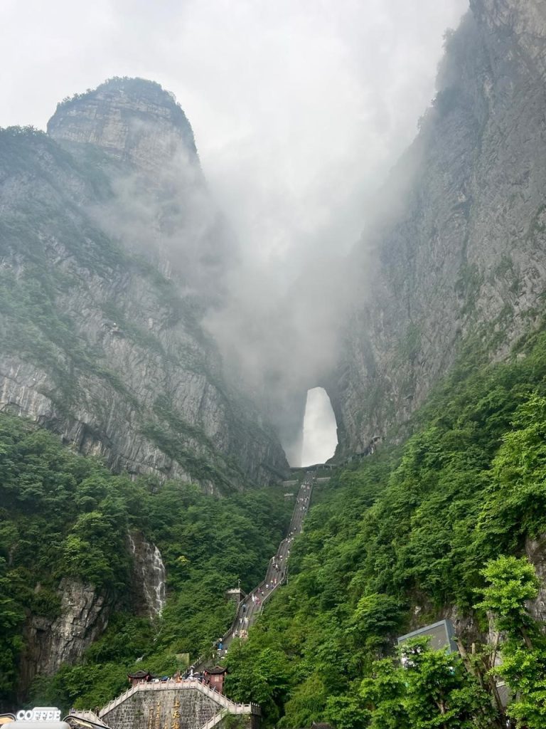 Finalmente encontramos una cueva con dos frentes, el posterior por el que acabamos de entrar, daba a un profundo cañón y el anterior daba a la legendario escalinata de 999 escalones de piedra “La Puerta al Cielo” (Tianmen).