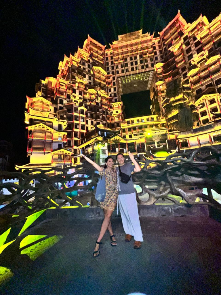 Por la noche fuimos a la Wonder Tower, un enorme edifico que réplica la arquitectura tradicional, dentro se encuentra teatros, tiendas y restaurantes. A las 20:00 inició el show de luces y proyecciones, baile con un Mazinger gigante, mientras cientos de bailarines con ropa tradicional giraban alrededor de un artista que cantaba una melodía pegajosa.