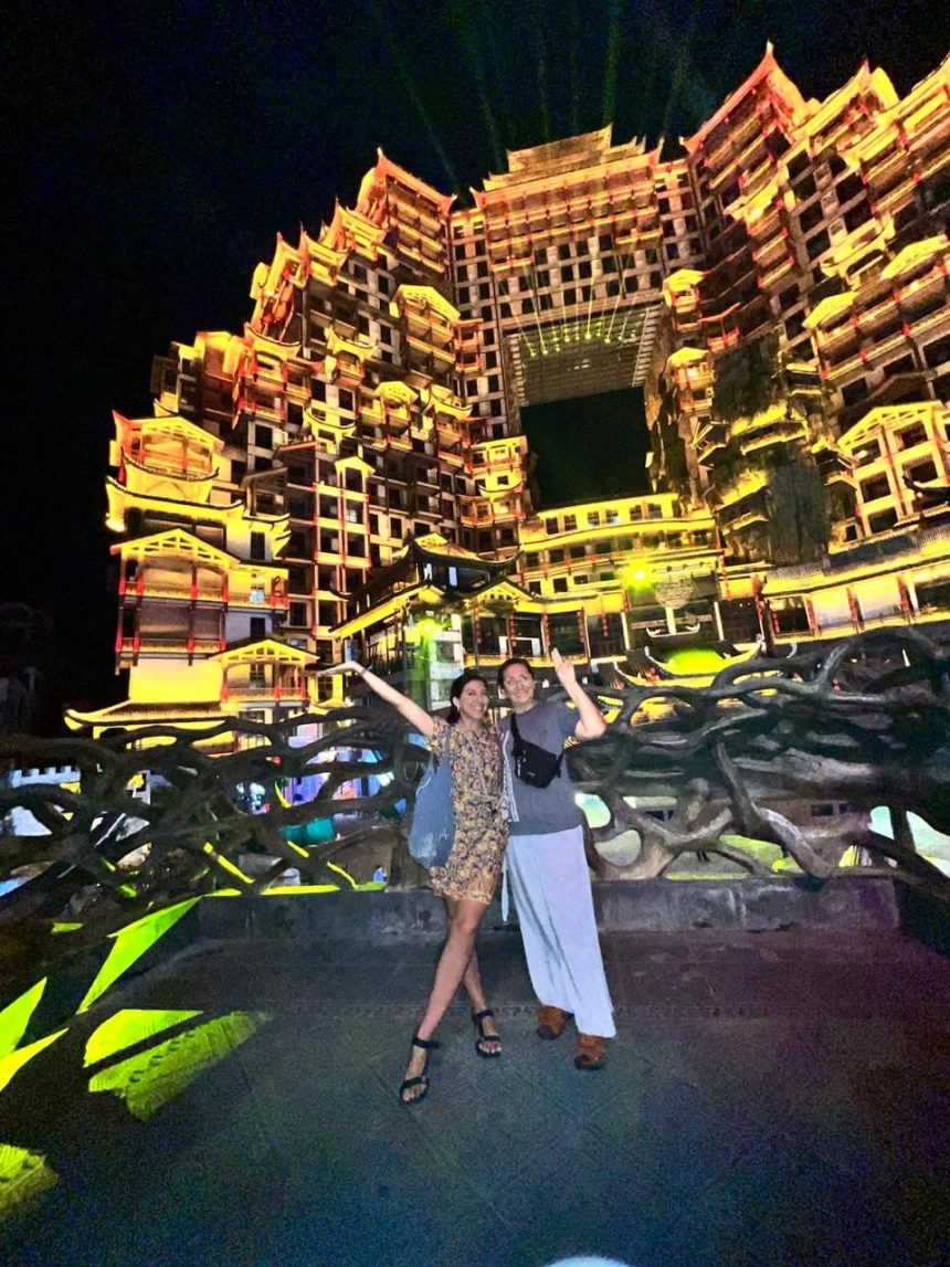 Por la noche fuimos a la Wonder Tower, un enorme edifico que réplica la arquitectura tradicional, dentro se encuentra teatros, tiendas y restaurantes. A las 20:00 inició el show de luces y proyecciones, baile con un Mazinger gigante, mientras cientos de bailarines con ropa tradicional giraban alrededor de un artista que cantaba una melodía pegajosa.
