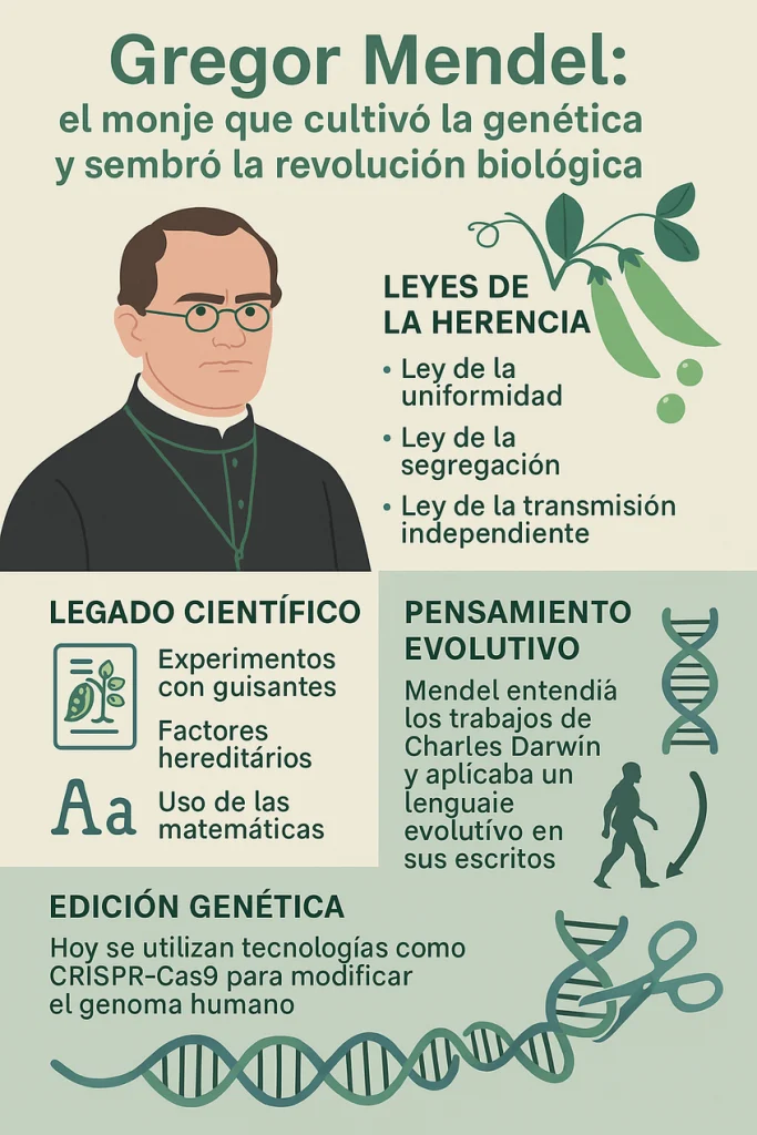 El 20 de julio conmemoramos el nacimiento de Gregor Mendel (1822-1884), el enigmático monje agustino que, sin saberlo, colocó las primeras piedras de la genética moderna. Lo hizo desde el pequeño huerto de su monasterio en Brünn (actual Brno, República Checa), cruzando guisantes, aplicando álgebra y desafiando silenciosamente los paradigmas de su época. Ciento cuarenta años después de su muerte, su figura sigue despertando fascinación, no solo por su genio precoz, sino por las circunstancias insólitas, prudentes o acaso trágicas que marcaron su vida y obra.