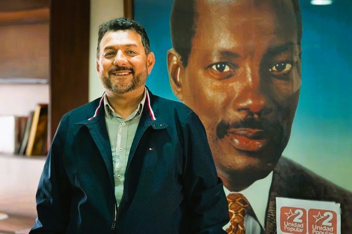 Geovanni Atarihuana Ayala es el Director Nacional de Unidad Popular. Tiene 53 años, es hijo de maestros. Fue presidente de la FESE y la FEUE. En la sede del partido, en el tradicional barrio América (centro-norte de Quito), posa frente a una fotografía de Jaime Hurtado González, líder histórico del Movimiento Popular Democrático, asesinado el 17 de febrero de 1999. Fotos: Luis Argüello / Plan V