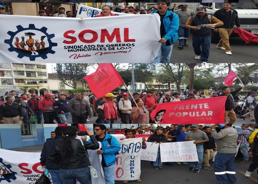 El Sindicato de Obreros Municipales de Loja este 26 de julio iniciaron la huelga de brazos caídos y protagonizaron una importante marcha junto a demás organizaciones del Frente Popular de Loja. Desde tempranas horas de la madrugada paralizaron sus actividades en los diferentes puestos de trabajo. Los dirigentes y trabajadores proclamaron el inicio de la lucha contra el alcalde Franco Quezada para que cumpla con las siguientes demandas; entrega inmediata de implementos de seguridad y las herramientas de trabajo que les permita cumplir con sus obligaciones laborales a favor del pueblo, pero a su vez, tener condiciones de llegar vivos a sus hogares y no sufrir algún accidente laboral.