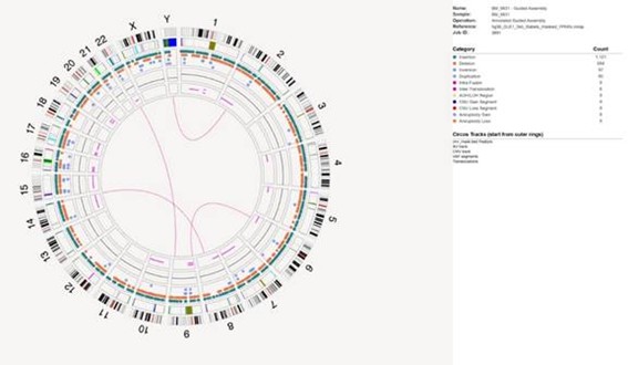 La imagen obtenida mediante esta tecnología (Figura 2) ofrece una representación integral del genoma, donde se visualizan simultáneamente los cromosomas y sus reordenamientos, facilitando una interpretación más completa del paisaje genético tumoral.