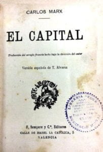 Hasta antes y durante la primera guerra mundial, según hemos podido averiguar consultando los catálogos de algunas librerías, [11] en el Ecuador, se conocen las siguientes obras marxistas. De Marx: Precios, salarios y ganancias, Manifiesto Comunista, El Capital y estudio sobre el socialismo científico, Miseria de la filosofía. Contestación a Proudhon y Crítica de la Economía Política. De Federico Engels: Origen de la familia, propiedad privada y el Estado, Anti–Dürhing o la revolución de la ciencia, El socialismo utópico y el socialismo científico, El socialismo y la religión. De Marx y Engels: Comunista (Manifiesto) por Carlos Marx y Federico Engels. Los títulos están copiados como constan en los catálogos consultados. Cuando se menciona El Capital de Marx, se trata con seguridad del primer tomo traducido al castellano en el siglo XIX, pues que se enuncia un solo libro.