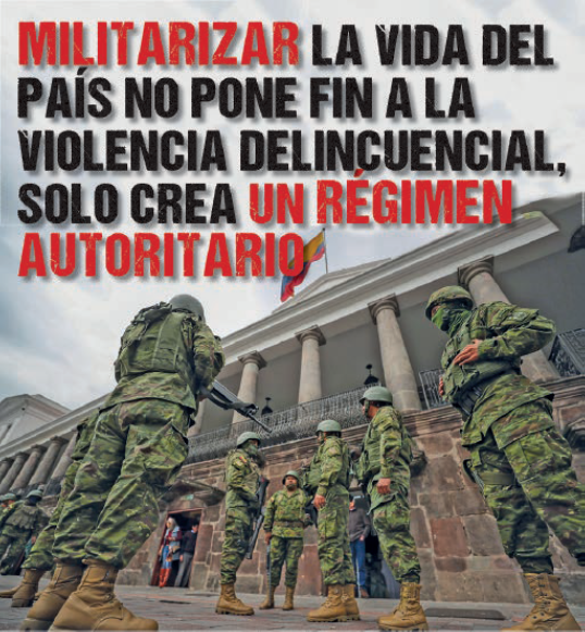 La propuesta de reforma constitucional para permitir el establecimiento de bases militares extranjeras en el territorio nacional; la denominada Ley de Solidaridad Nacional, que entre otras disposiciones garantiza la impunidad de miembros de la Policía y las Fuerzas Armadas; la propuesta de Ley Orgánica de Inteligencia, Inteligencia Estratégica y Contrainteligencia que se tramita en la Asamblea Nacional; la práctica reiterada de gobernar en base a la declaratoria de estados de excepción; y la naturalización de la presencia de las FFAA en las calles son medidas concretas que apuntan claramente hacia una militarización del país y el debilitamiento de los derechos democráticos de la población.
