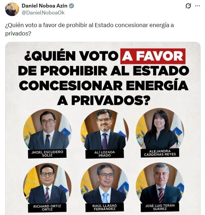 En otro post preguntó [7] ¿Quién voto a favor de prohibir al Estado concesionar energía a privados? y publicó las fotografías de los 6 vocales de la Corte Constitucional que votaron por la inconstitucionalidad del numeral 1 del artículo 25 de la LOSPEE y las 3 fotografías de los vocales que salvaron sus votos.