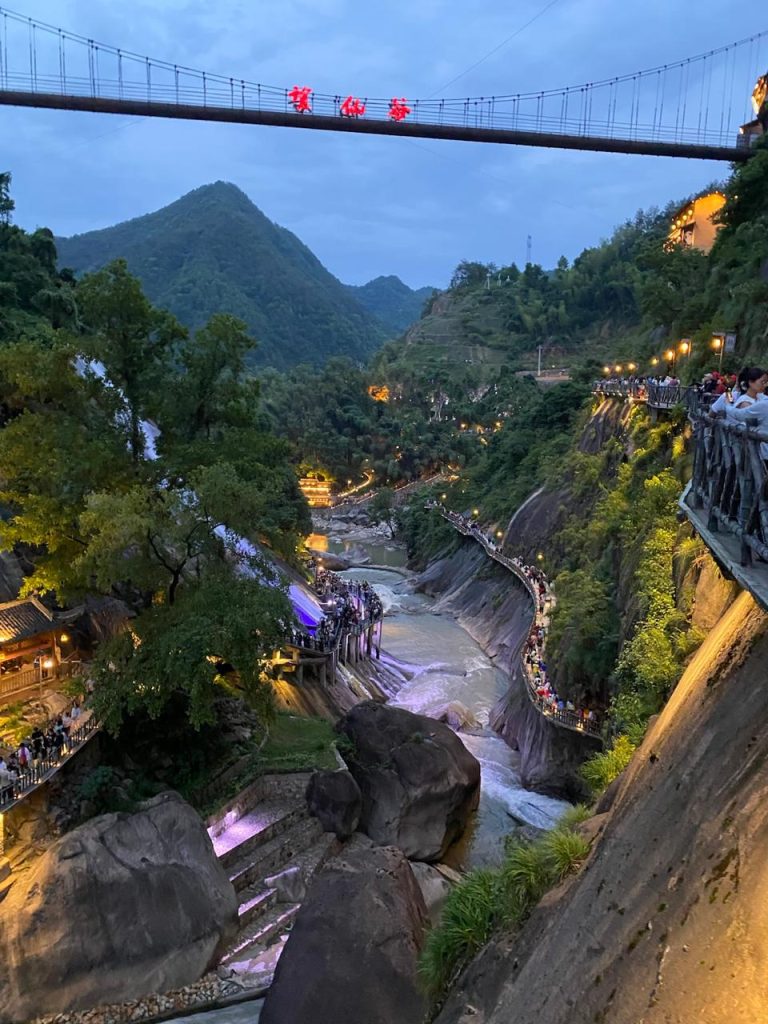 En Jiangxi nos esperaban el valle del Wangxi, una antigua cantera transformada en complejo turístico, tras una hora en bus llegamos, una mansión tradicional; luego, tras cruzar un puente colgante, sobre el Wangxi, tomamos un sinuoso sendero, colgado de las paredes verticales de un cañón, que hablaba de millones de años de historia con enormes rocas salpicadas de musgo que soportaban el peso del mundo alrededor: cascadas, bosques umbríos, arriba situado en el borde mismo del acantilado un pueblo ancestral desafiaba al tiempo.